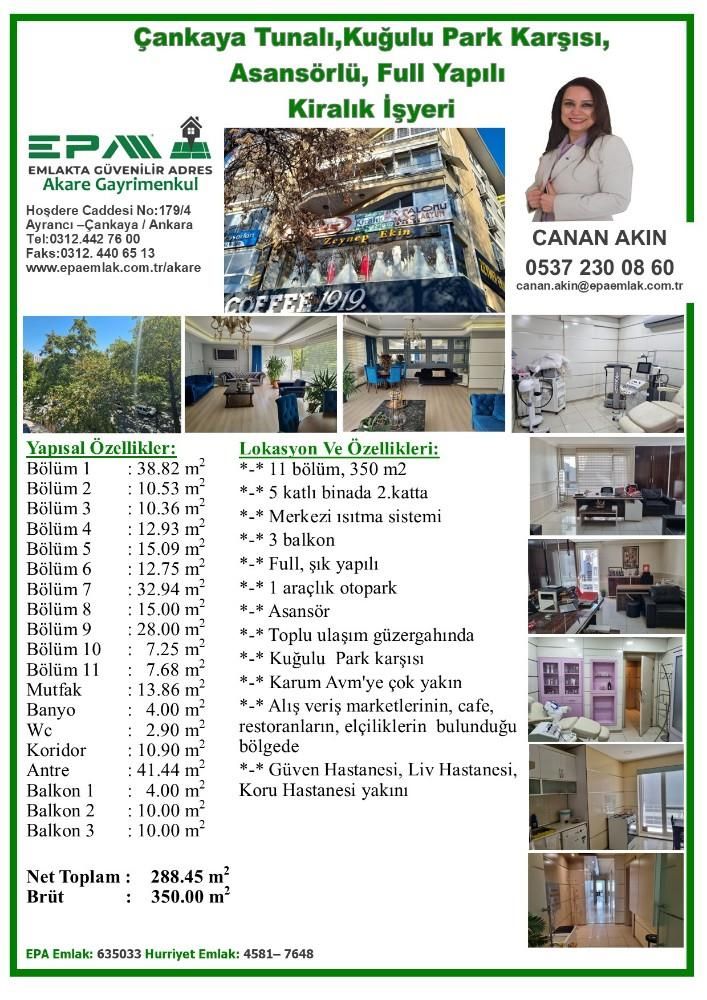 Çankaya Tunalı,Kuğulu Park Karşısı,Asansörlü, Full Yapılı İşyeri / Yorumlar